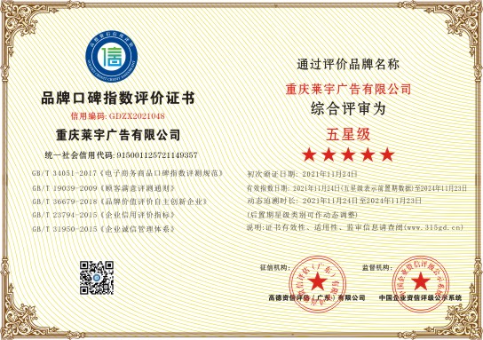 重庆莱宇广告有限公司成立于2011年03月28日,注册地位于重庆市南岸区学府大道50号,法定代表人为廖常委。经营范围包括许可项目:从事建筑相关业务。(依法须经批准的项目,经相关部门批准后方可开展经营活动,具体经营项目以相关部门批准文件或许可证件为准) 一般项目:设计、制作、代理、发布国内广告;标识标牌制作、安装服务;广告展示器材、广告喷写设备及配件销售;网站建设;会展服务;公共活动策划;企业营销策划。(除依法须经批准的项目外,凭营业执照依法自主开展经营活动)